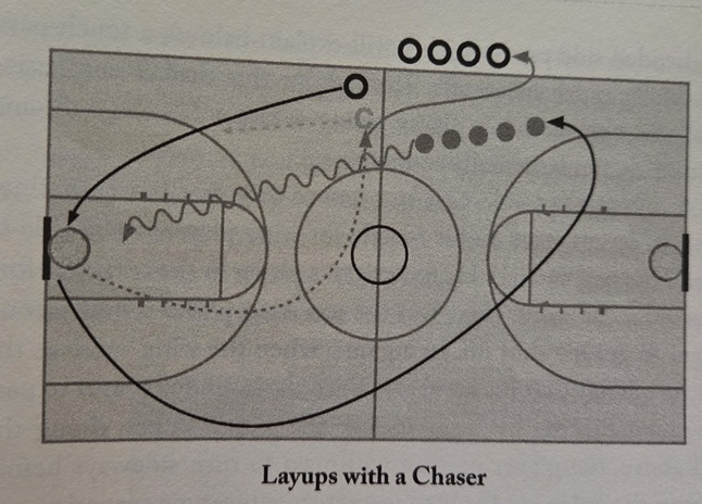 - Layups with a chaser – 2 lines at half way, coach with the ball. RH line runs and receives the pass from the coach. Second line must chase, then they swap lines and return the ball to the coach. See image below